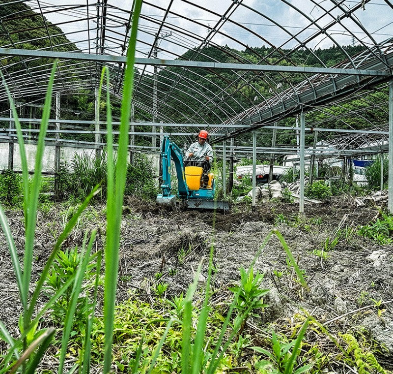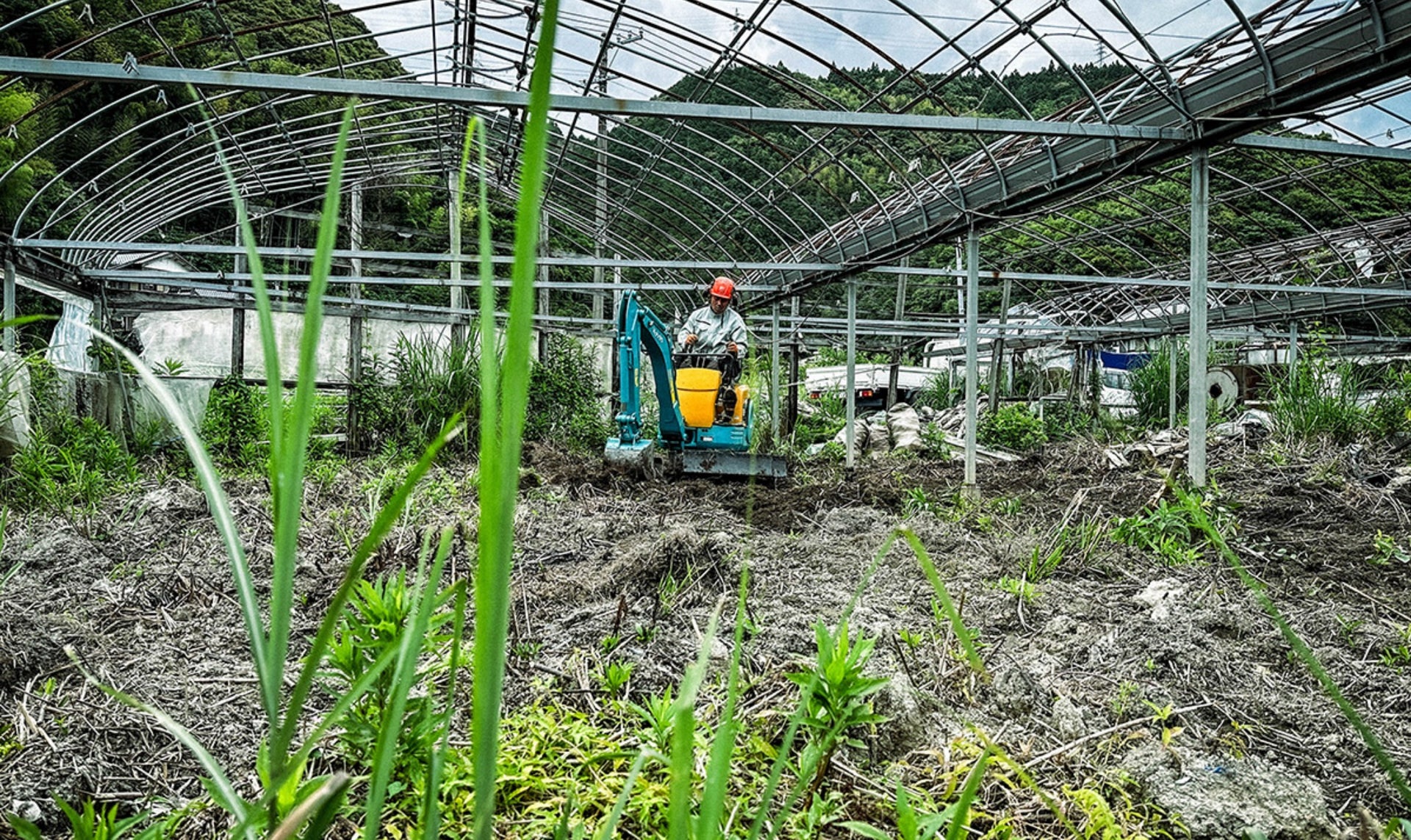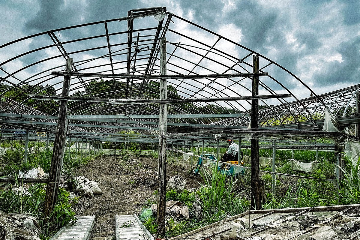 実際に2024年、日高村で放置されたままだった耕作放棄地を、林業家の小川さんに耕してもらい土佐八升豆を植えました。ここは何年も前に使われないまま放置されていたビニールハウス。
